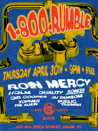 1-800-Rumble on April 30, 2026 at 1-800-Lucky, Miami features Ron Mercy, //DLM, Duality (US), DB Cooper, Bonita Applebumz, DJ Tamsom and Topher the Alien performing breakbeat DJ sets.