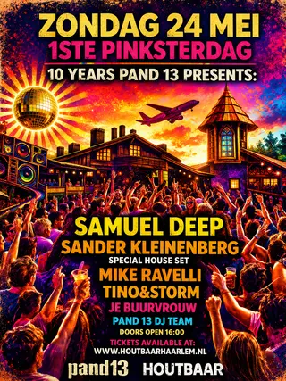 10 yrs of Pand 13 presents Samuel Deep & Sander Kleinenberg on May 24, 2026 at Houtbaar Haarlem, Amsterdam features Samuel Deep, Sander Kleinenberg, Mike Ravelli and Je Buurvrouw performing house DJ sets.