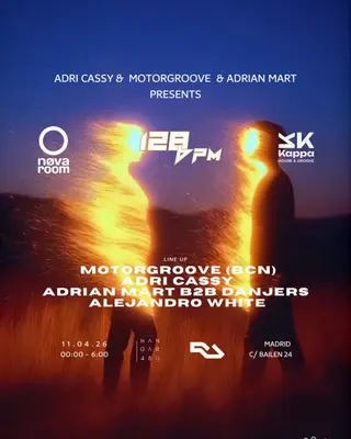 128BPM & NOVA ROOM & KAPPA on April 11, 2026 at Hangar48 Club, Madrid features MOTORGROOVE, Adrian Mart and Danjers performing tech house DJ sets.