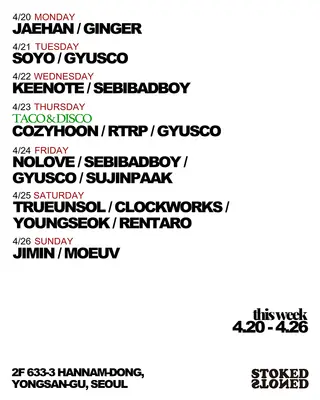 20 April - 26 April on April 20, 2026 at Stoked&stoned, Seoul features Youngseok, Gyusco, Sebibadboy, JAEHAN (2), Soyo, Keenote, Cozyhoon, RTRP, Nolove, SUJINPAAK, TRUEUNSOL, Jimin and Moeuv performing house DJ sets.
