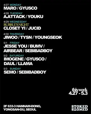 27 April - 3 May on April 27, 2026 at Stoked&stoned, Seoul features Youngseok, Gyusco, Sebibadboy, YOUKU, Closet Yi, Jucid, Jiwoo Ahn, TYSN, Jesse You, bumv, Airbear, Imogene, Daul, llama (1) and Semo performing house DJ sets.