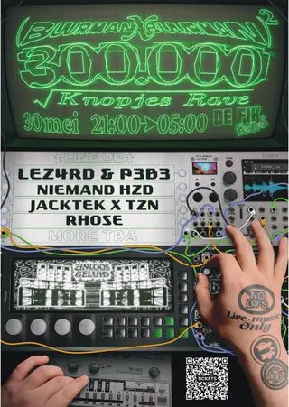 300000 Knopjes Rave takes place at De Fik Garden in Amsterdam, Netherlands on May 30, 2026. Techno and Acid sounds all night.
