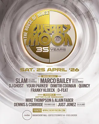 35 Years Cherry Moon takes place at Cherry Moon in Lokeren, Belgium on April 25, 2026. Featuring Slam, Marco Bailey. Techno sounds all night.