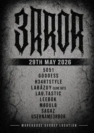 3Rror takes place at a secret warehouse location in London, United Kingdom, on May 29, 2026. This event features a lineup of artists within the techno and industrial genres. Usernam3rror, known for their experimental techno sound, presents a unique approach to the genre. Goddess II, an emerging artist in the industrial scene, has been gaining attention for their hard-hitting beats and atmospheric productions. Lau.tastic brings a distinct style influenced by both techno and industrial elements, showcasing their versatility. Labåzuy rounds out the lineup with a focus on dark techno, contributing to the event's heavy sound. The event will highlight the intense and driving nature of techno and industrial music through its selected artists.