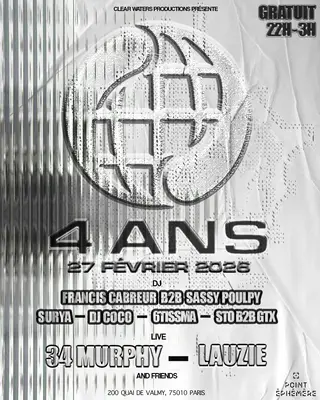 4 ans Clear Waters Productions takes place at Point Ephémère in Barcelona, Spain on February 27, 2026. Featuring Dj Coco. Hip-Hop sounds all night.