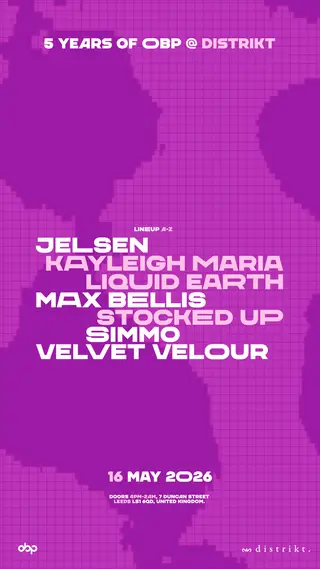 5 Years of OBP w/ Liquid Earth & Velvet Velour on May 16, 2026 at Distrikt, Leeds features Liquid Earth, Velvet Velour, Jelsen and simmo performing house DJ sets.