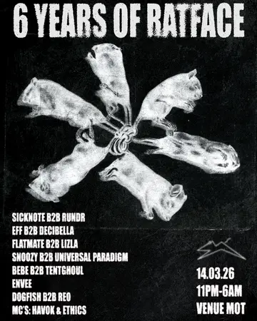6 YRS OF RATFACE: Sicknote B2B RUNDR, Decibella B2B EFF + MORE takes place at M.O.T in London, United Kingdom on Saturday, March 14, 2026. Featuring Sicknote, RUNDR, Decibella, Dogfish and 3 more. Drum & Bass, Jungle.