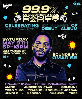 99.9%: An Electric Soul Dance Party - Celebrating 10 Years Of KAYTRANADA's Debut Album at SOBs in New York, United States on May 9, 2026. Electro and Funk / Soul sounds all night.