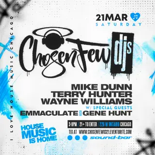 A Chosen Few Djs Event at The Legendary Soundbar. House Music takes place at Sound-Bar in Chicago, United States on March 21, 2026. Featuring Mike Dunn, Terry Hunter. House and Deep House sounds all night.