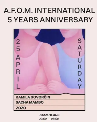A.F.O.M 5th Birthday takes place at Sameheads in Berlin, Germany on April 25, 2026. Featuring Sacha Mambo, Kamila Govorčin, Zozo.