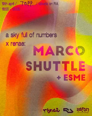 Experience a sky full of numbers x renae: Marco Shuttle & Esmé 2026, a significant moment in Manchester, United Kingdom's electronic music calendar on Sunday, April 19, 2026, featuring Marco Shuttle and Esmé. This event brings together artists and fans who share a passion for dance music culture and Techno sounds.