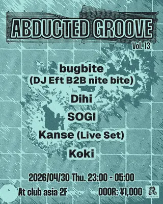 Abducted Groove Vol.13 takes place at clubasia in Tokyo, Japan on April 30, 2026. Featuring DJ Eft, SOGI, Dihi, Kanse. House and Electro sounds all night.