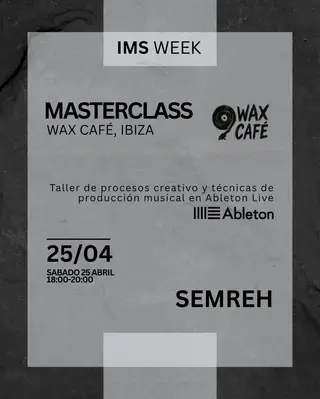 ABLETON live & VINYL MASTERCLASS - IMS Ibiza Week takes place at TBA - WAX Cafè - C/ de Carles V, 9, 07800 Eivissa in Ibiza, Spain on April 25, 2026. Featuring SEMREH, Pablo Ballesta. Techno and Electro sounds all night.