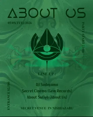 ABOUT US takes place at TBA - Secret location in Nishi Azabu in Tokyo, Japan on May 5, 2026. Featuring DJ Sodeyama, Secret Cinema, ABOUT SOFIYA. Techno and Tech House sounds all night.