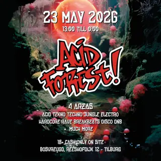 Acid Forest takes place at Bosvreugd Cultuurbos in Tilburg, Netherlands on May 23, 2026. Featuring Tommy The Cat. Hardcore and Jungle sounds all night.