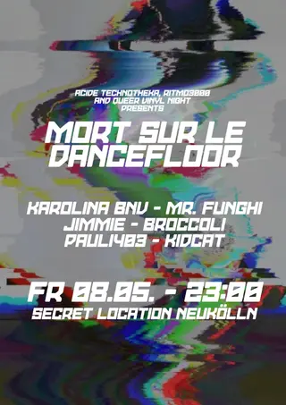 Acide Technotheka x Ritmo 3000 x Queer Vinyl Night presents: Mort sur le Dancefloor on May 8, 2026 at TBA - Secret location Neukölln, Berlin features Karolina Bnv, Mr. Funghi, Jimmie and Kidcat performing electro DJ sets.