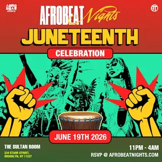 Afrobeat Nights NYC takes place at The Sultan Room in New York City, United States on June 19, 2026. Hip-Hop and Afrobeat sounds all night.