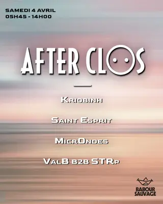 AFTER CLOS X Babour Sauvage #2 takes place at Babour Sauvage in Paris, France on April 4, 2026. Featuring Kriòbinh. Progressive House and Minimal sounds all night.