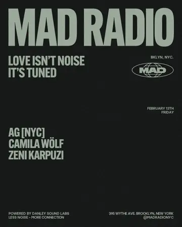 AG[nyc], Camila Wölf, Zeni Karpuzi 2026 takes place at the renowned MAD Radio NYC in New York, United States on Friday, February 13, 2026, featuring AG (NYC), Camila Wolf, Zeni Karpuzi and 0 more artists. This event brings together artists and fans who share a passion for dance music culture and House sounds.