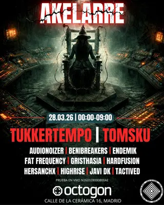 AKELARRE at Octogon 360 2026 takes place at the renowned Laboratorio Octogon in Madrid, Spain on Saturday, March 28, 2026. This event brings together artists and fans who share a passion for dance music culture and Hardcore sounds.