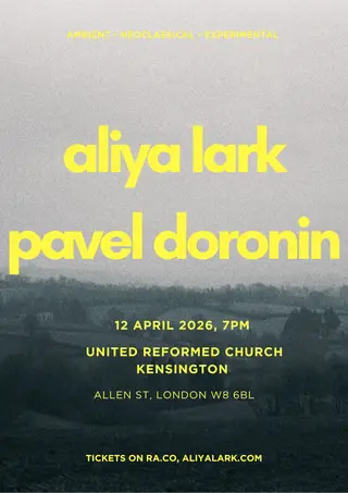 Aliya Lark and Pavel Doronin Concert in London on April 12, 2026 at Kensington United Reformed Church, London features Aliya Lark and Pavel Doronin performing ambient DJ sets.