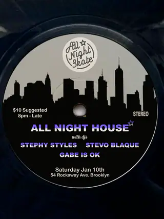 ALL NIGHT HOUSE with Stephy Styles, Stevo Blaque, gabe is ok on January 10, 2026 at All Night Skate, New York features Stevo Blaque and gabe is ok performing DJ sets.