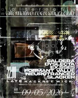 Alternative Recreation Club on May 9, 2026 at TBA - Secret Location, London features Caldera, Dyslecta, ex.sses, Formant Value, Neurotrancer and Slacker (GB) performing bass DJ sets.