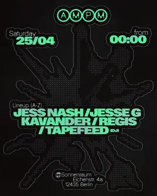 AM:PM at Sonnenraum with Regis, Jesse G, Tapefeed (Dj), Jess Nash, Kavander on April 25, 2026 at Sonnenraum, Berlin features Jess Nash, Jesse G, Regis, Jonathan Kavander and Tapefeed performing techno DJ sets.