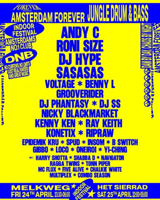 Amsterdam Forever - Andy C on April 24, 2026 at Melkweg, Amsterdam features Andy C, Benny L, Grooverider, Hixxy, Slipmatt, Kenny Ken, Nicky Blackmarket, DJ Ollie, DJ SS, Charlie B, Harry Shotta, Navigator and Tonn Piper performing drum & bass DJ sets.