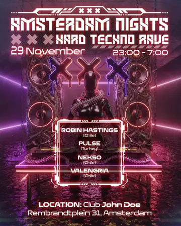 Amsterdam Nights: Hard Techno Rave w/ Robin Hastings [CL], Pulse [TUR], Nekso [CL] & Valengria takes place at John Doe in Amsterdam, Netherlands on Saturday, November 29, 2025. Featuring Robin Hastings, PULSE (NL), Valengria.