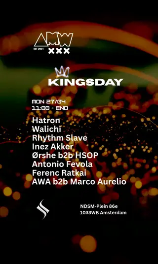 Amsterdam's Most Wanted × Sonocratica Kingsday at NDSM on April 27, 2026 at Amsterdams Most Wanted, Amsterdam features Walichi, Inez Akker, HSOP, Antonio Fevola and Ferenc Ratkai performing techno DJ sets.