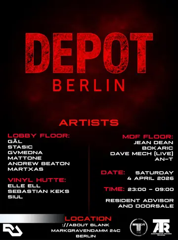 Amsterdam Techno Records and DEPOT BERLIN [Amsterdam & Berlin] takes place at ://about blank in Berlin, Germany on Saturday, April 4, 2026. Featuring gãl (SI), STASIC, GVMEDNA, Mattone and 8 more. Techno.