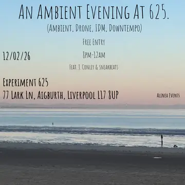 An Ambient Evening At 625. Join us on the 12th February at Lark Lanes finest 'Experiment 625' for a meditative mellow ambient evening from 8pm-12am (free entry). Enjoy a mixture of electronic live sets and dj sets including some vinyl sets from local Liverpool legend, DJ and Sound Designer sneakBeats as well as Alineg Events cofounder J. Conley, with genres ranging from Ambient, Drone, IDM, Electronica, Downtempo, Post-Rock and more. Additionally to the music, expect live art including live drawing and painting from talented local artists of Liverpool. Anyone interested in coming along and showing their art feel free to email us @alinea.events.team@gmail.com or message alinea.events / sneakbeats_dj on Instagram. (Optional donation available at the event).