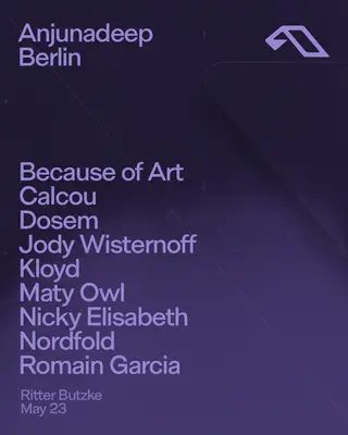 Anjunadeep Berlin (Daytime Open Air & Club Festival) on May 23, 2026 at Ritter Butzke, Berlin features Because of Art, Calcou, Dosem, Jody Wisternoff, Kloyd, Nicky Elisabeth, Nordfold and Romain Garcia performing techno DJ sets.