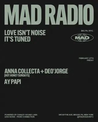Anna Collecta + Deo'Jorge / Ay Papi takes place at MAD Radio NYC in New York, United States on February 27, 2026. Featuring Anna Collecta. House and Disco sounds all night.