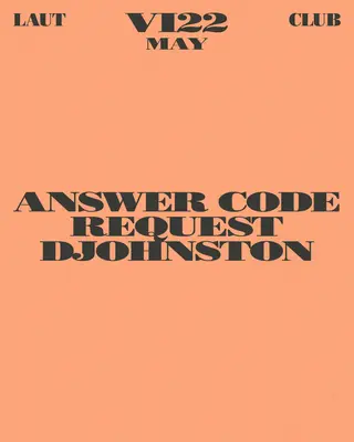 Answer Code Request + DJohnston takes place at LAUT in Barcelona, Spain on May 22, 2026. Featuring Answer Code Request, DJohnston. Techno sounds all night.