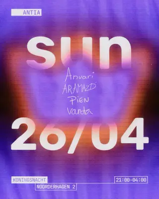 ANTIA KING'S NIGHT takes place at ANTIA in All, Netherlands, on April 26, 2026. The event features Anvari, a techno producer known for his distinctive sound that blends elements of minimal and melodic techno. Anvari has gained recognition within the techno scene for his innovative productions and performances. The night will focus on the techno genre.