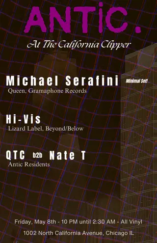 Antic: Michael Serafini & Hi-Vis takes place at The California Clipper in Chicago, United States on May 8, 2026. Featuring Michael Serafini, Hi-Vis. Tech House and Minimal sounds all night.