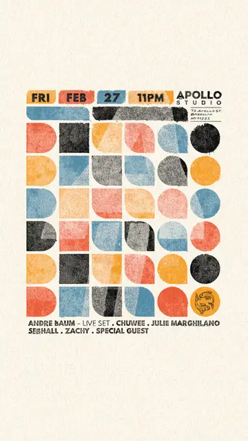 Apollo Studio Special Celebrations w Andre Baum Live Set, Julie Marguilano, Chuwee, zacky takes place at Apollo Studio in New York City, Unknown on Friday, February 27, 2026. Featuring André Baum, Chuwee, Julie Marghilano, Seb Hall and 1 more.