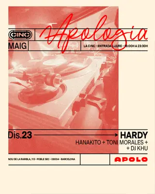 Apologia x HARDY Bcn at la CINC (Sala Apolo) at Sala Apolo in Barcelona on Saturday, May 23, 2026. Hanakito and Toni Morales headline the event. The House lineup also includes Dj Khu.