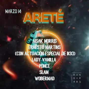 ARETE: AISAK MORRIS, ERNESTO MARTINS, IKKD, Lady Vanilla, PONCE, SLAM, WOBERMAD takes place at Hangar48 Club in Madrid, Spain on March 14, 2026. Featuring Lady Vanilla, WOBERMAD. Tech House.