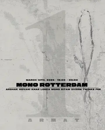 Armat One Year Anniversary takes place at Mono in Rotterdam, Netherlands on Saturday, March 14, 2026. Featuring Hovani. Techno.