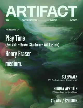 Artifact – An Experimental Music Series takes place at Sleepwalk in New York City, United States on April 19, 2026. Experimental sounds all night.