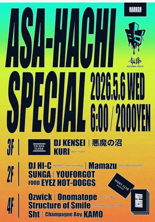 Asa-Hachi -Special- on May 6, 2026 at Aoyama Hachi, Tokyo features DJ Kensei, Compuma, Dr. Nishimura, DJ HI-C, Mamazu, Sunga, YouForgot and Ozwick performing techno DJ sets.