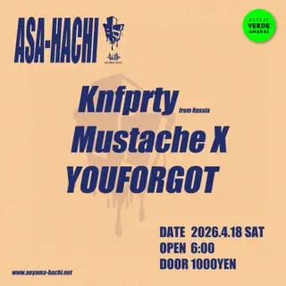 Asa-Hachi takes place at Aoyama Hachi in Tokyo, Japan, on April 18, 2026. The event features techno artists Mustache X and YouForgot. Mustache X is known for his driving beats and has made a name for himself in the techno scene. YouForgot, also a techno producer, brings a unique sound characterized by deep basslines and intricate rhythms.