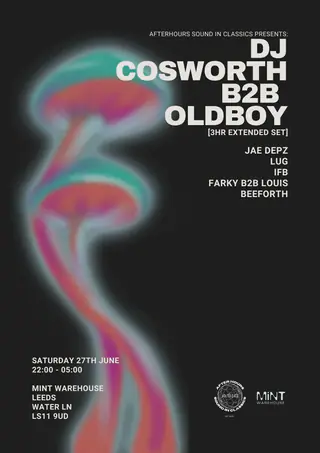 ASIC presents: DJ Cosworth B2B Oldboy takes place at Mint Warehouse in Leeds, United Kingdom on June 27, 2026. House and Garage sounds all night.