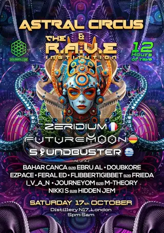 Astral Circus vs The R.A.V.E. Institution on October 17, 2026 at Distillery N17, London features Ebru Al, DoubKore, FlibbertiGibbet, frieda (IT), JourneyOM and Nikki S performing psytrance DJ sets.