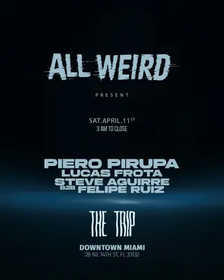 ATC features Piero Pirupa, Lucas Frota, Steve Aguirre, and Felipe Ruiz at The Trip in Miami on April 11, 2026. Piero Pirupa is known for his contributions to the house and tech house genres, originating from Italy. Lucas Frota is a Brazilian DJ recognized for his energetic sets in the house music scene. Steve Aguirre hails from the United States and is noted for his tech house productions. Felipe Ruiz is also a US-based artist, contributing to the house genre with his distinct sound. This event showcases a lineup that emphasizes house and tech house music.