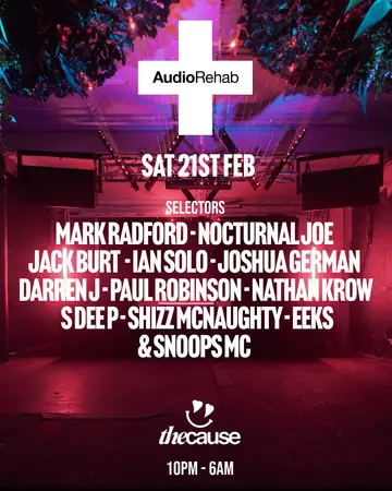 AudioRehab takes place at The Cause in London, United Kingdom on Saturday, February 21, 2026. Featuring Mark Radford, Nocturnal Joe, Jack Burt, Paul Robinson and 5 more. Tech House, Deep House.