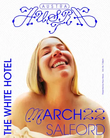 Austra takes place at The White Hotel in Manchester, United Kingdom on Sunday, March 22, 2026. Featuring Austra. New Wave, Electronica.